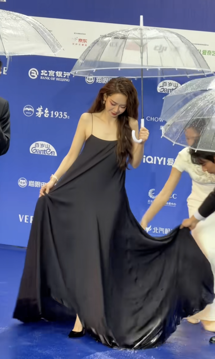 刘浩存穿着后开叉的礼服,下摆也没逃过被积水浸湿,不过小姑娘还挺敬业的,对着镜头依旧笑靥如花,该营业还得营业。
