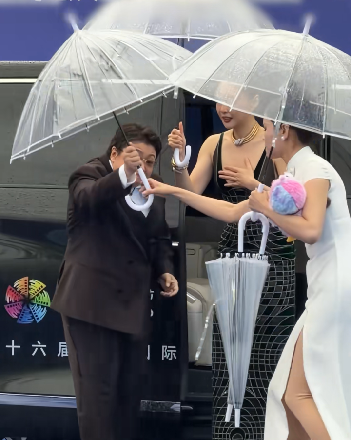 高叶见状立刻把伞偏向韩红,直到韩红又接过工作人员递过来的另一把伞,也有了遮挡,高叶才默默收回自己撑的那把伞。