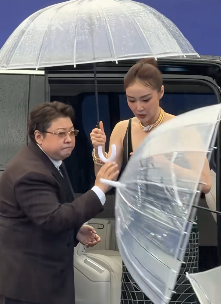 于是乎,我们看到了平时红毯看不到的一幕,穿着高定礼服,化着精致妆容的女明星们个个撑着一把伞,提了裙子没顾上雨伞,多少有几分狼狈。